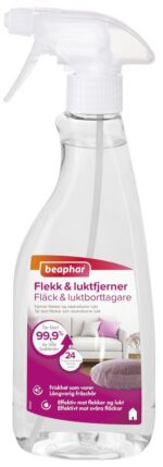 Beaphar flekk- og luktfjerner er fremstilt for bruk rundt kjæledyr. Produktetfjerner raskt og effektivt 99,9 % av bakteriene som lever av organisk søl og girvond lukt, for eksempel urin, avføring og oppkast. Produktet fjerner flekkersom lukt etter uhell. Den fjerner ikke bare gjenstridige flekker og luktfullstendig, men også sykdomsfremkallende organismer. Den sikrerkjæledyrene og din familie friskhet som varer og antibakteriell beskyttelse iinntil 24 timer. Egner seg til tekstiler, kurver, kattemøbler, tepper, kattedoer,bilinteriør, søppelkasser osv