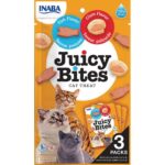 Juicy Bites er uimotståelig fuktige, perfekt møre godbiter av tunfisk og kylling krydret med naturlige smaker, grønn teekstrakt og vitamin E. Ingen korn, konserveringsmidler eller kunstige farger. Hver pakke inneholder tre individuelle godbitpakker for å opprettholde maksimal friskhet, og hver godbitpakke har to morsomme former i to forskjellige smaker for å holde kattene glade.
