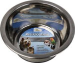 En enkel mat- og drikkeskål i rustfritt stål med antiskli belegg under slik at skålen stør støtt og ikke glir på faste underlag.