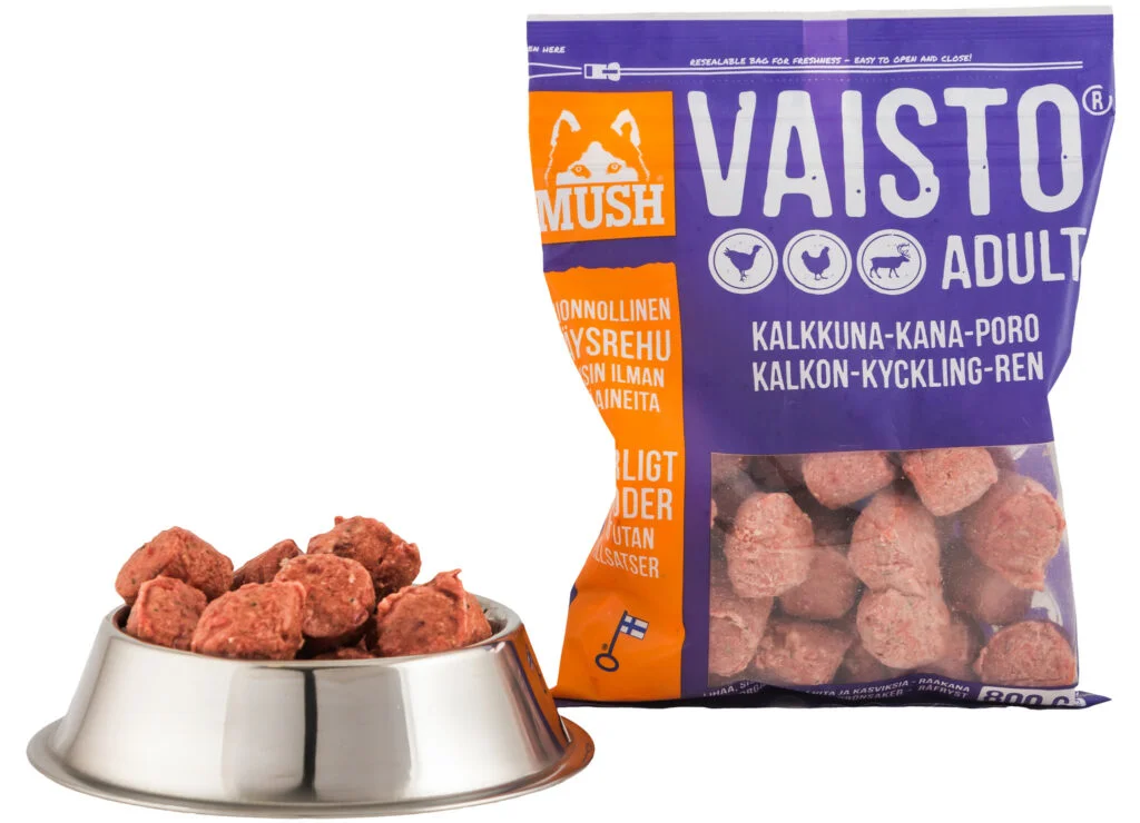 Vaisto Mush er produsert i Finland og jobbet ut i fra BARF begrepet “Biologically Appropriate Raw Food”, altså biologisk tilpasset til hunden og katten. Posene inneholder runde boller som gjør det lettere å tilpasse hvor mye hunden skal ha. Bollene er ca. 25 gram hver. Maten er fryst og må tines i porsjoner. For å gi hunden og katten den rette næringen er det brukt 3 forskjellige protein i hver variant. Blandingen av rått kjøtt, ben, fett, grønnsaker og frukt gir hunden og katten det de trenger av vitaminer, aminosyrer og mineraler. Fôret er kun tilsatt gode råvarer og inneholder ingen kunstige tilsetningsstoffer.