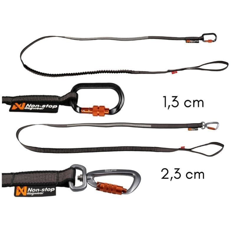 Touring bungee med 13 millimeter bredde leveres med en lett men karabinkrok med skrulås. Båndene med 23 millimeters bredde kommer med twistlock karabinkrok, en krok som låser seg automatisk og sikrer at hunden ikke kommer seg løs.