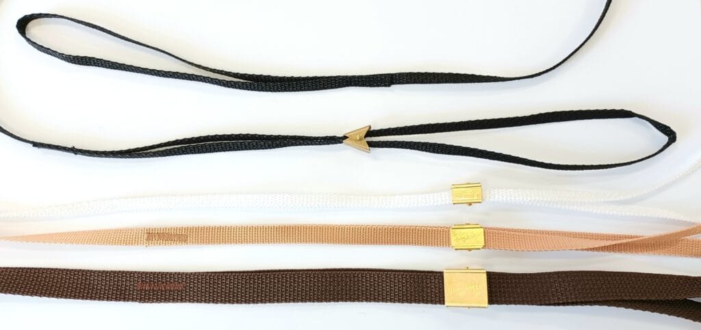 Klassisk utstillingsbånd m/messing/gullfarget klype, flat nylon line i god, nylonkvalitet. Tre ulike bredder; 6, 9 og 16mm. Farger: Svart, hvit, brun og mørk beige.